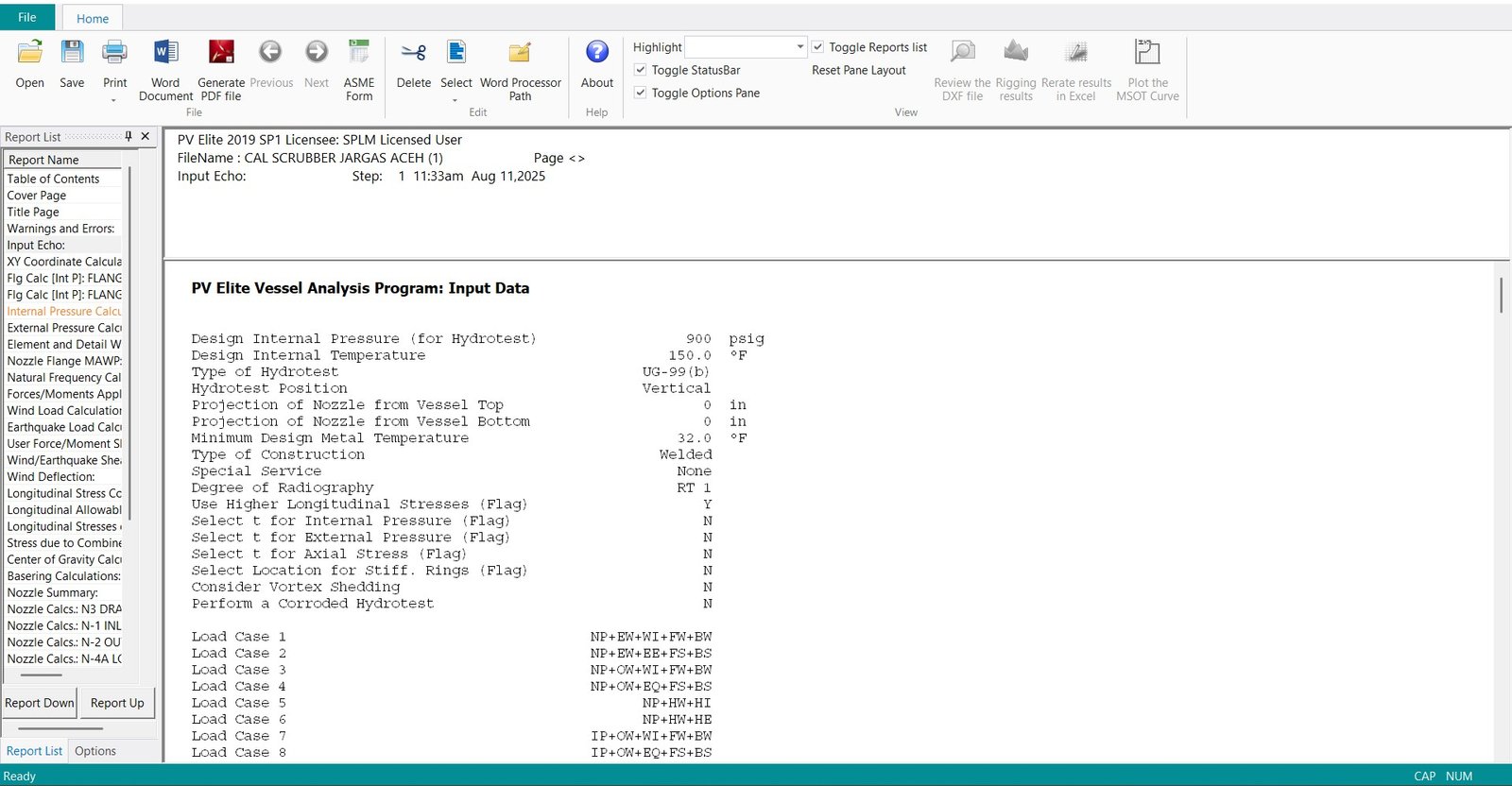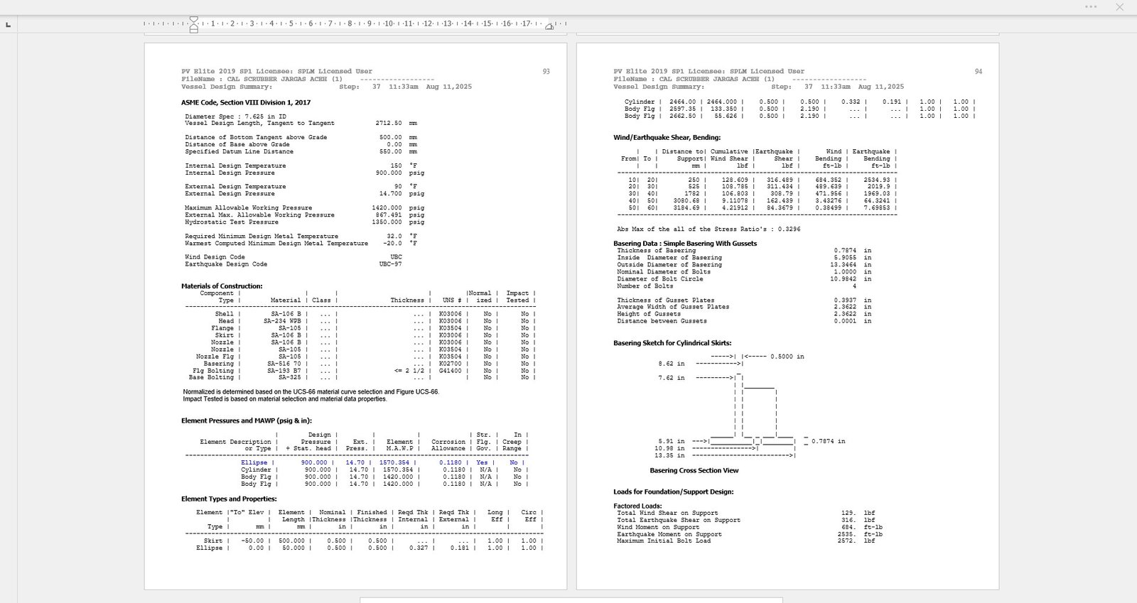 Bagian ini menyajikan hasil utama dari analisis struktural yang dilakukan oleh PV Elite, memastikan kepatuhan terhadap kode ASME.