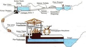 Aliran air → bendung → kantong lumpur → saluran pembawa → bak penenang → penstock → turbin → generator → listrik → jaringan distribusi.